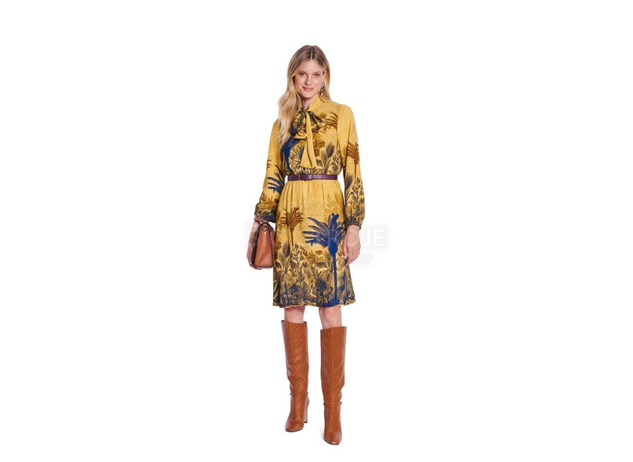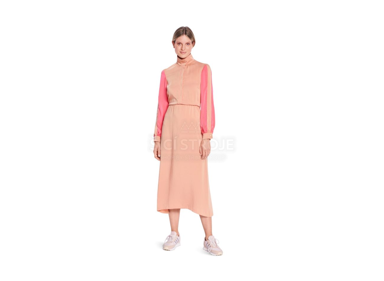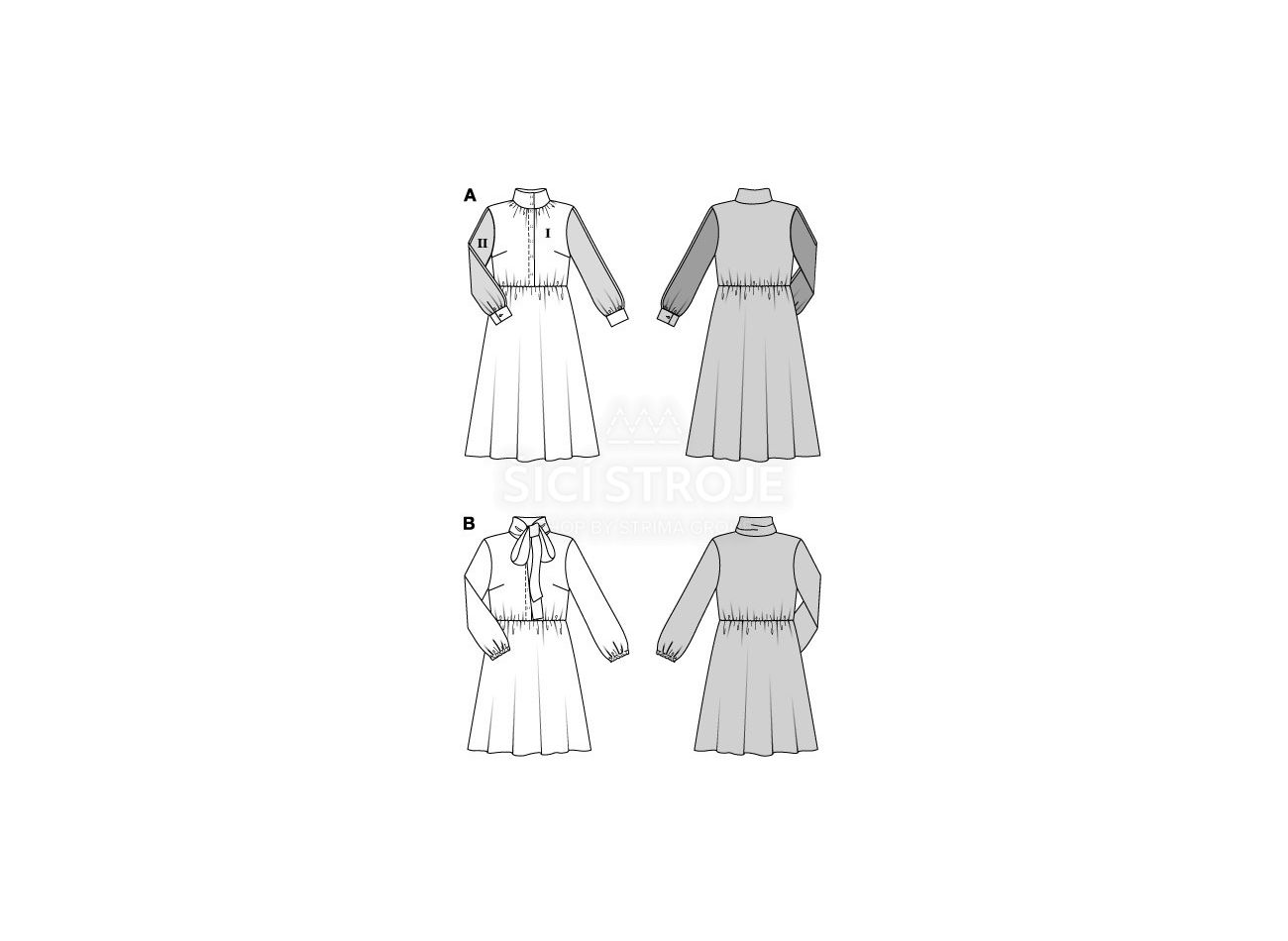 Strih Burda 5696 - Šaty s vysokým golierom, šaty s gumou v páse..