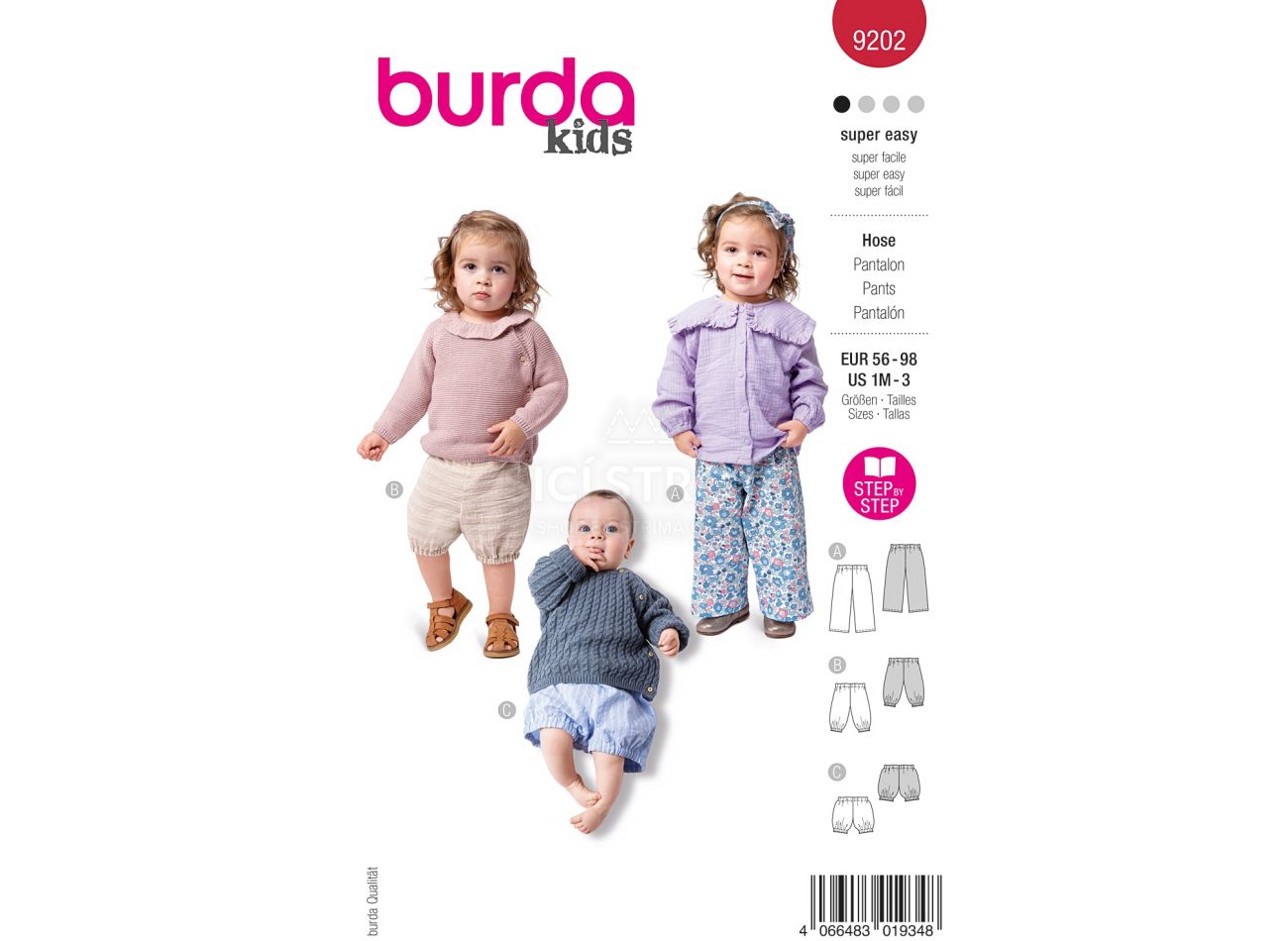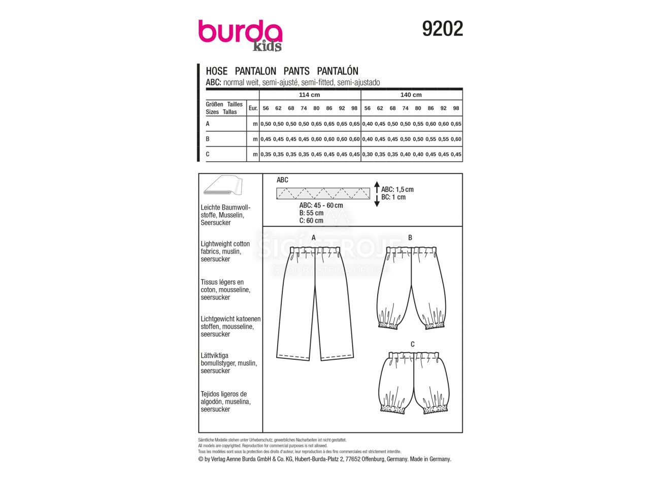 Strih Burda 9202 - Detské bavlnené nohavice a kraťasy s elastickým pásom..