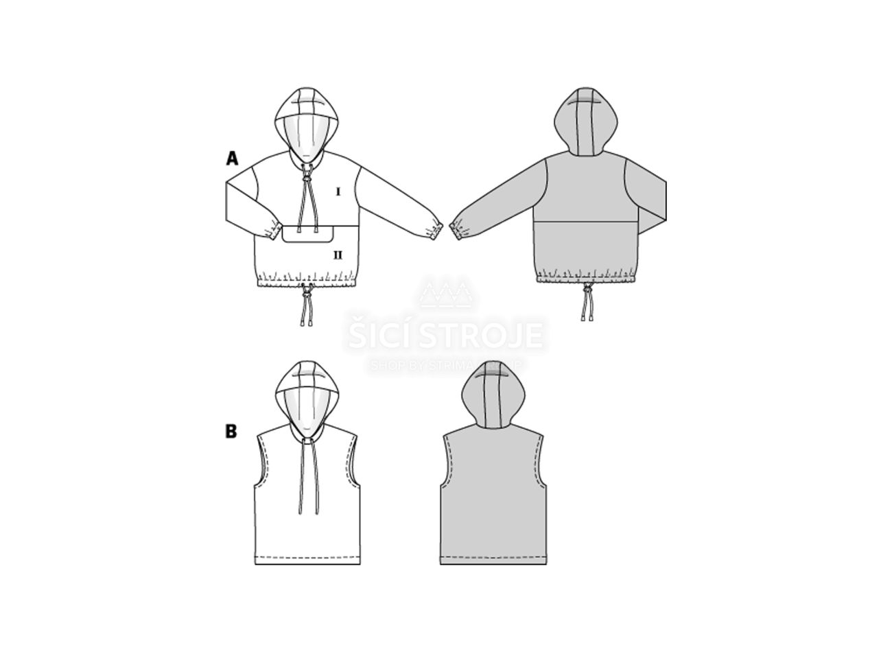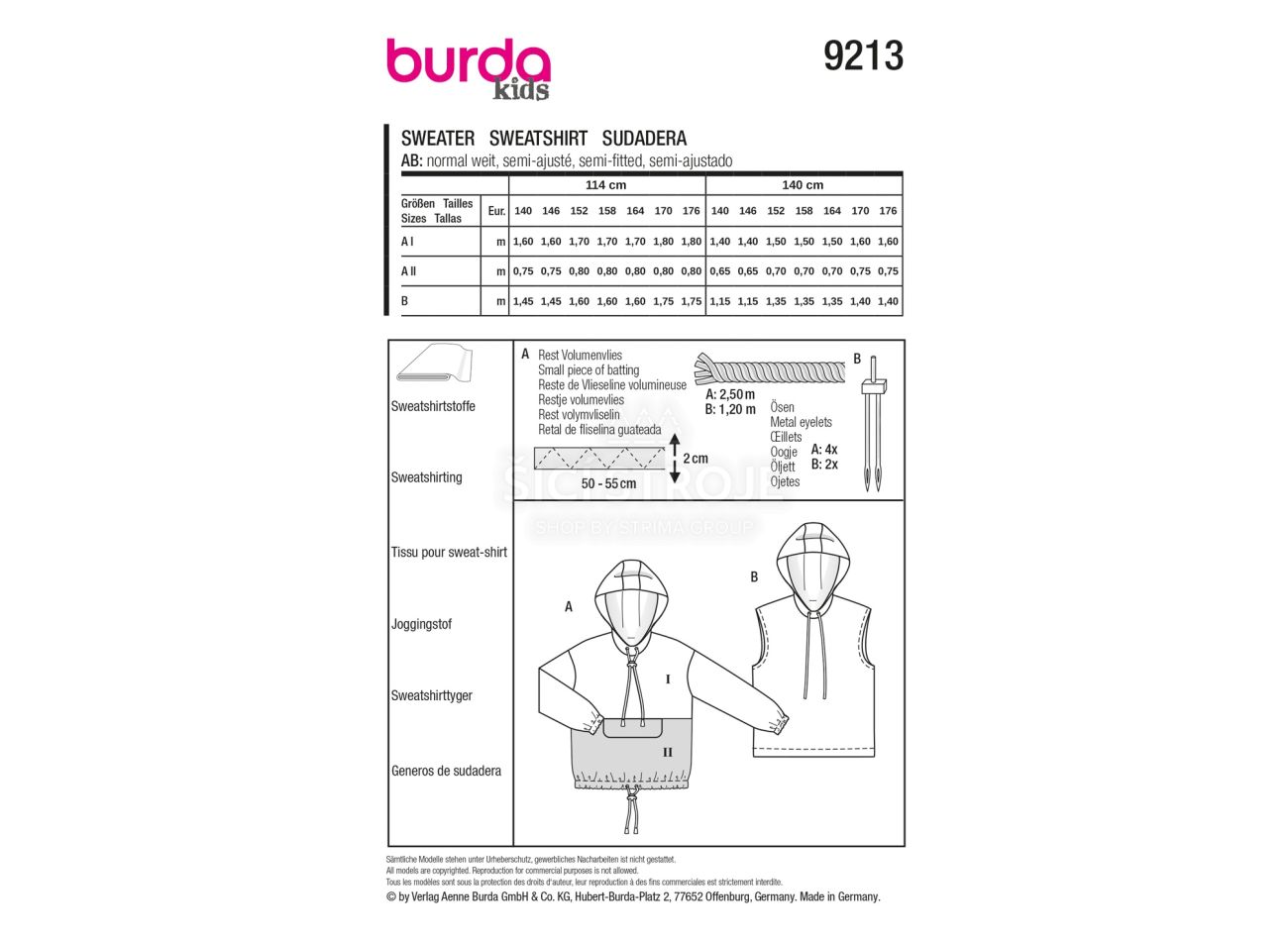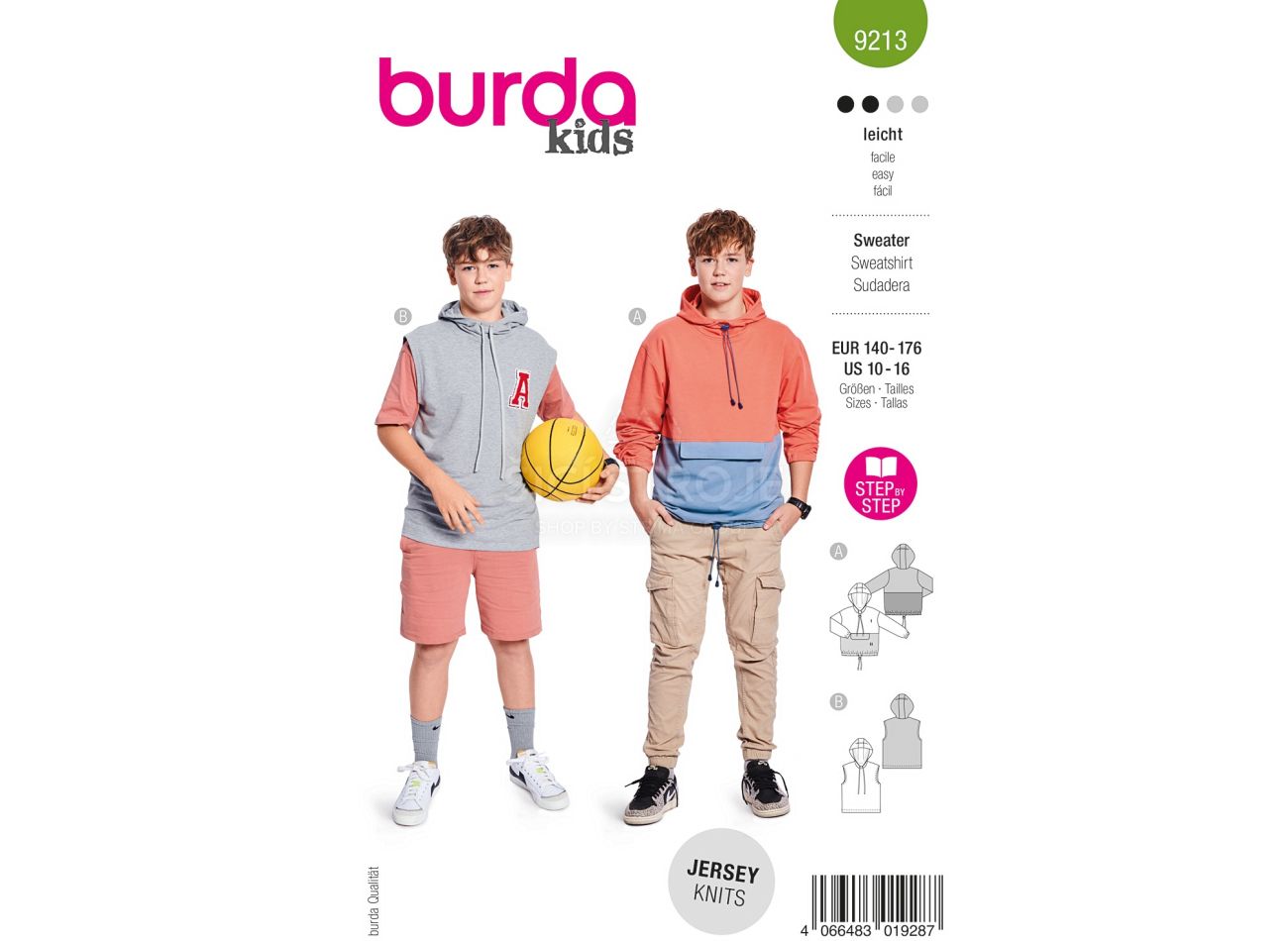 Strih Burda 9213 - Detská mikina s farebnými blokmi, chlopňami na vreckách a kapucňou..