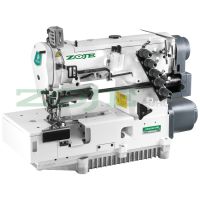 3-ihlový, 5-nitný plochý interlock na všívanie gumy s orezom látky sprava. Pre ľahké a stredné materiály. Súčasťou je zabudovaný servomotor v hlave stroja, ktorý znižuje vibrácie stroja. Rozpich ihiel je 5,6mm, zabudované diferenciálne podávanie, spodné a horné krytie s možnosťou vypnutia horného krytia, max. rýchlosť šitia je 5.000 stehov/min, centrálne mazanie. Kompletný šijací stroj s doskou a obratcom Kessler.